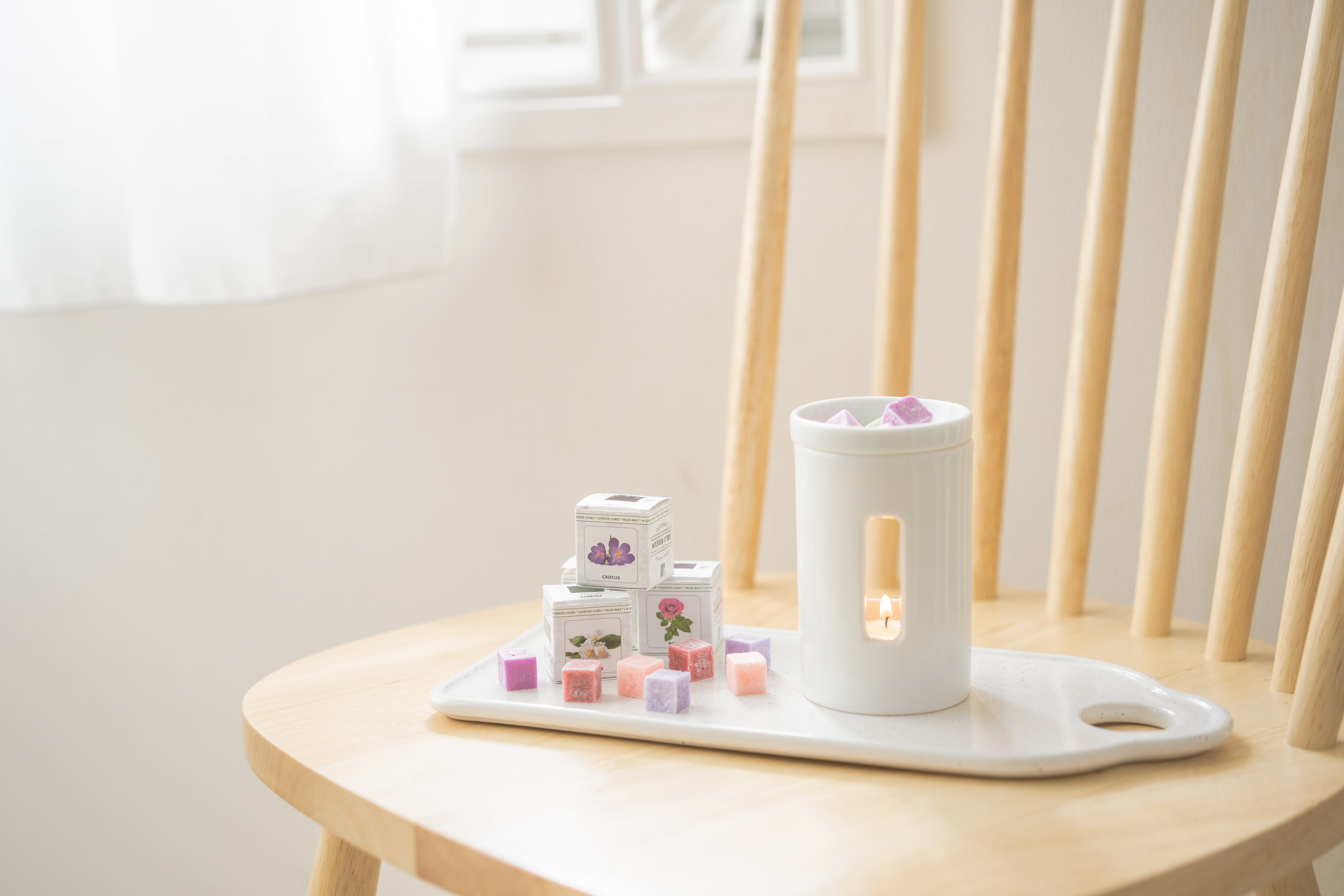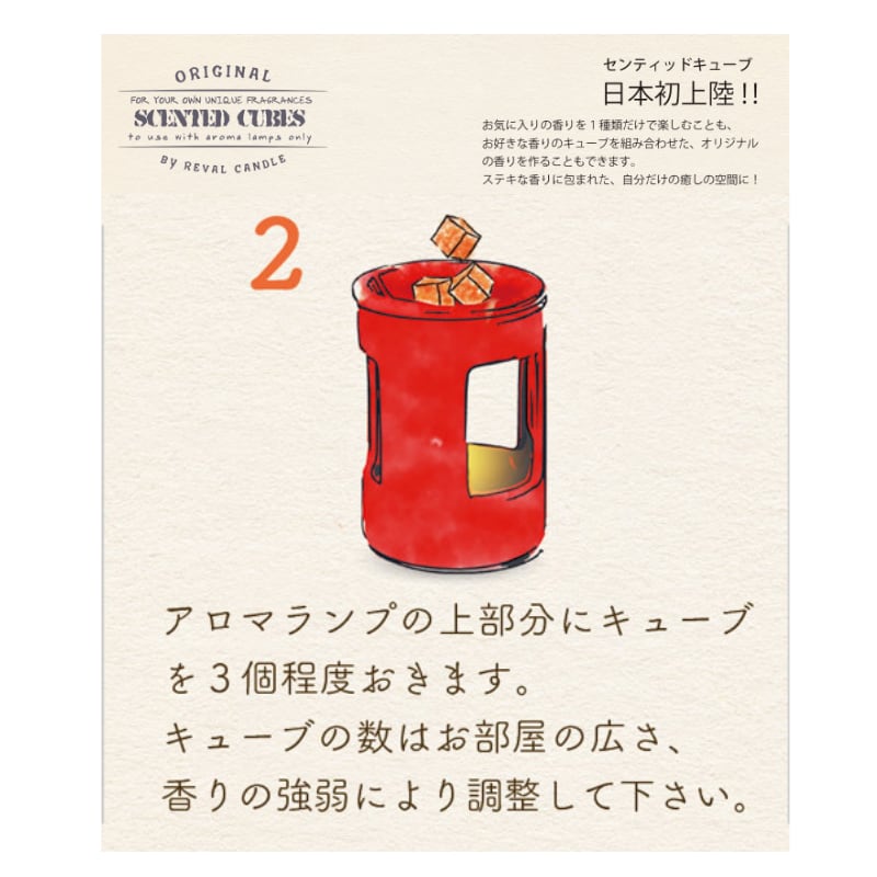 1.アロマランプにキャンドルをセットし、火をつけます。2.アロマランプの上部分にキューブを3個程度おきます。キューブの数はお部屋の広さ、香りの強弱により調整して下さい。3.キャンドルによる熱でキューブが溶けだします。溶けたキューブからお部屋いっぱいに香りが広がります。