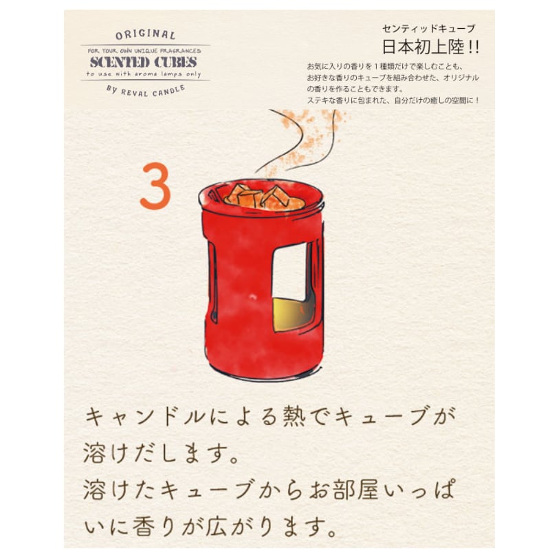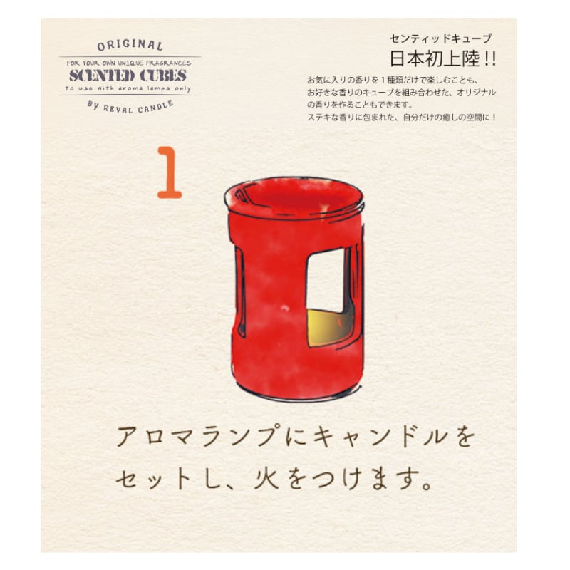 1.アロマランプにキャンドルをセットし、火をつけます。2.アロマランプの上部分にキューブを3個程度おきます。キューブの数はお部屋の広さ、香りの強弱により調整して下さい。3.キャンドルによる熱でキューブが溶けだします。溶けたキューブからお部屋いっぱいに香りが広がります。