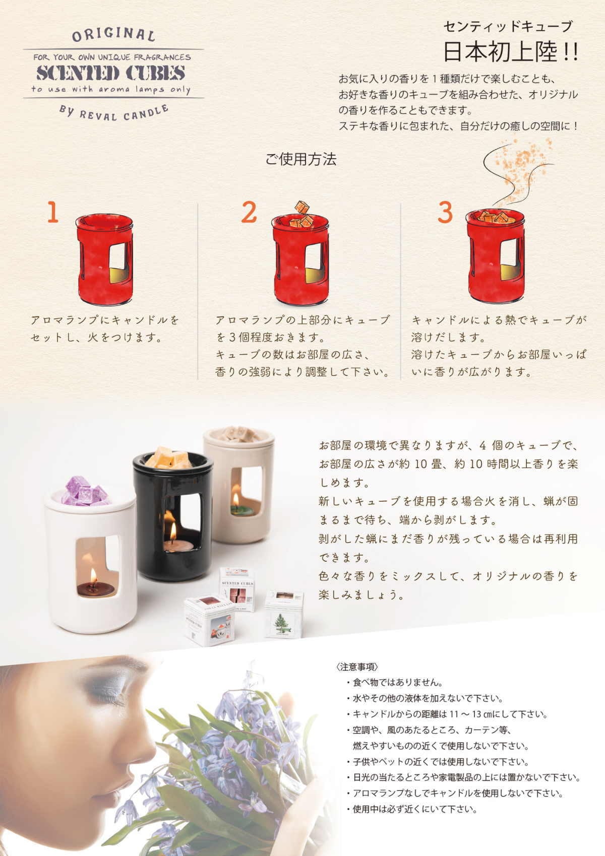 1.アロマランプにキャンドルをセットし、火をつけます。2.アロマランプの上部分にキューブを3個程度おきます。キューブの数はお部屋の広さ、香りの強弱により調整して下さい。3.キャンドルによる熱でキューブが溶けだします。溶けたキューブからお部屋いっぱいに香りが広がります。